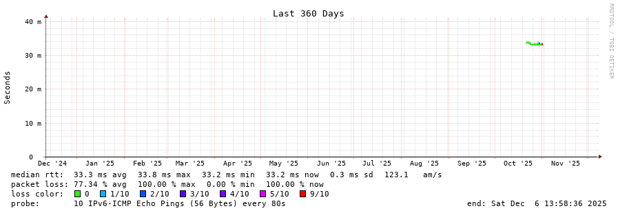 traceroute to 2a02:2f05:2113:7f00:220:4aff:fee0:220f (2a02:2f05:2113:7f00:220:4aff:fee0:220f), 30 hops max, 80 byte packets - Generated at 2025-12-06 13:45:01