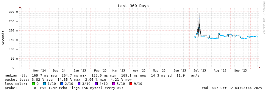 traceroute to 2604:2dc0:202:200::1f9 (2604:2dc0:202:200::1f9), 30 hops max, 80 byte packets - Generated at 2025-10-12 04:00:01